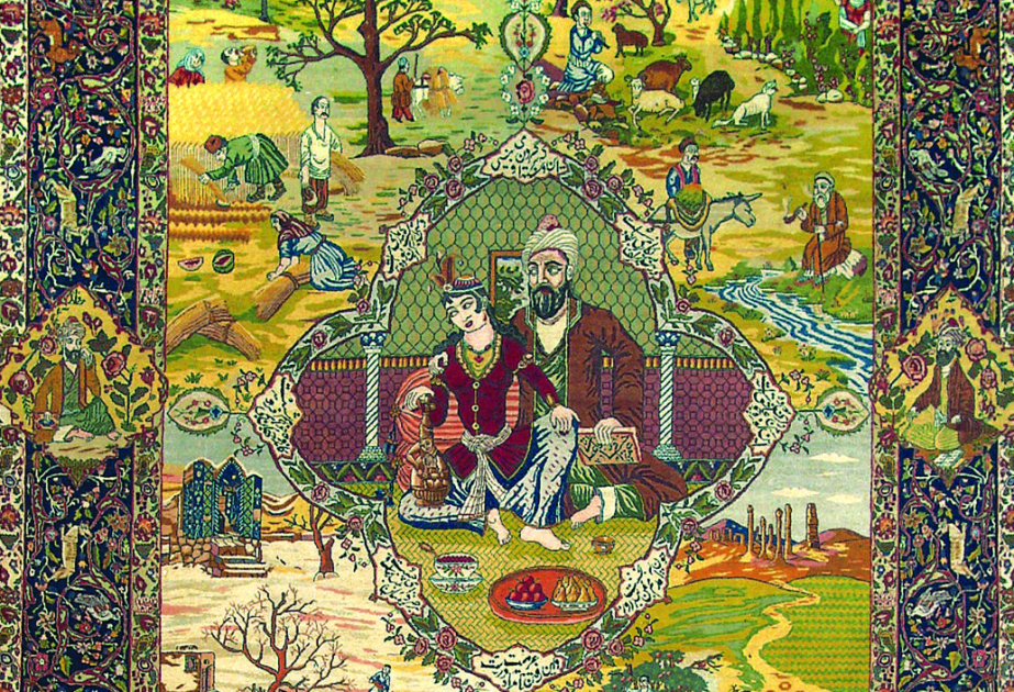 Xalçanın mərkəzi medalyonunda dahi Şərq şairi Ömər Xəyyam sevgilisi ilə birlikdə təsvir olunub. Bu təsvirlə yanaşı, haşiyələrdə Hafiz Şirazi, Əbdülqasım Firdovsi və Sədi Şirazi kimi klassiklər də təsvir olunub. Xalçanın digər hissələrində “Leyli və Məcnun”, “Xosrov və Şirin”, “Adəm və Həvva” və “İbrahimin qurbanı” kimi ədəbi və dini səhnələr təsvir olunub.